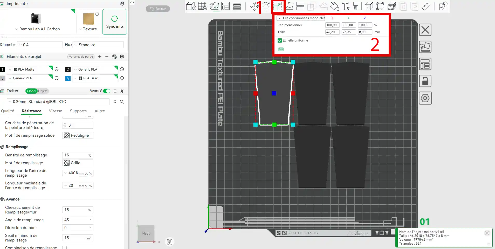 Vérifier que les dimensions de l'objet correspondent bien à la taille de l'objet souhaité. Sélectionner votre objet → Cliquer sur Redimesionner (1) → Vérifier sa taille (2)