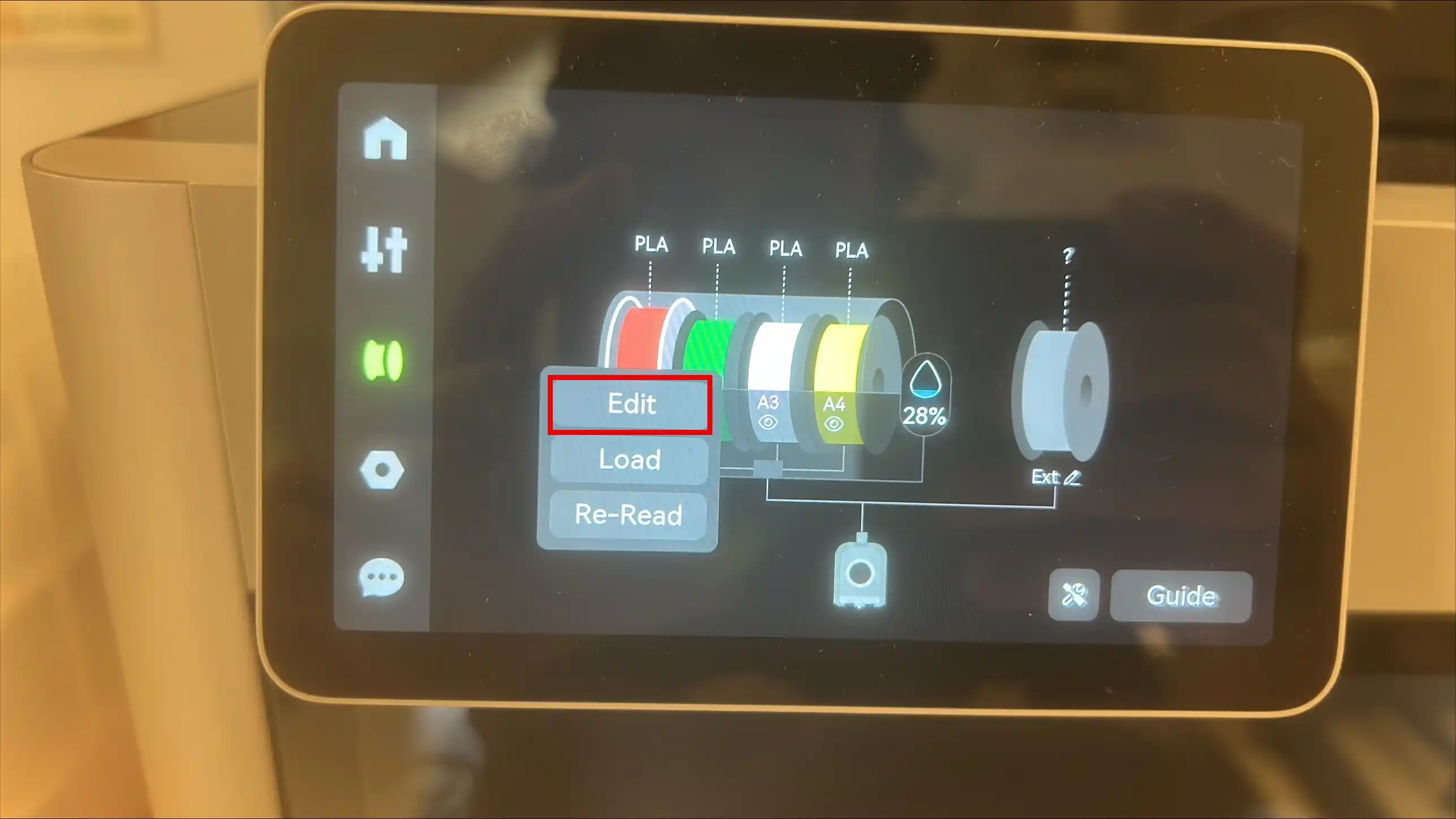 Indiquer manuellement les caractéristiques du nouveau filament à l’aide de l’écran tactile :