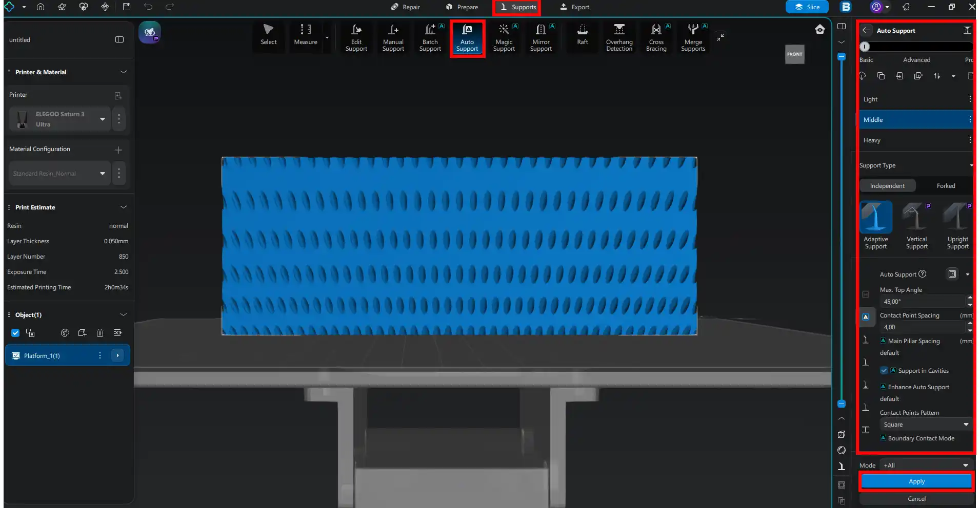 Cliquer sur Support → Auto support → Régler les paramètres de supports → cliquer sur Apply
