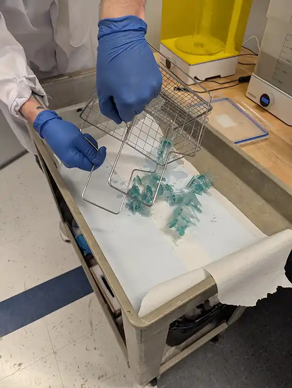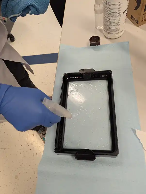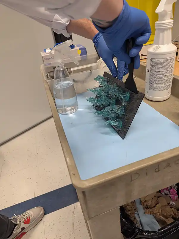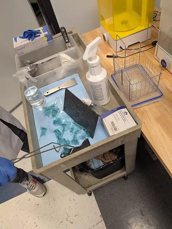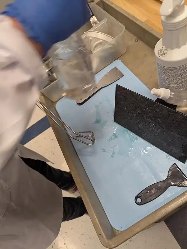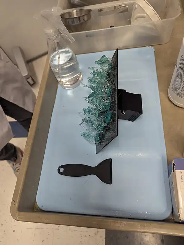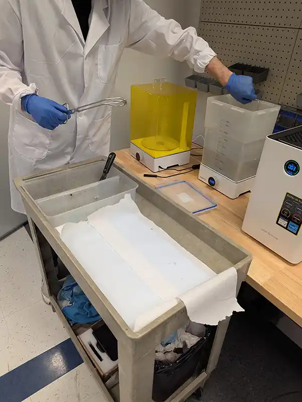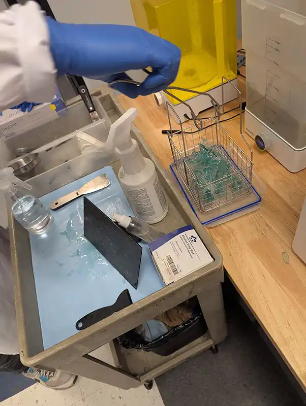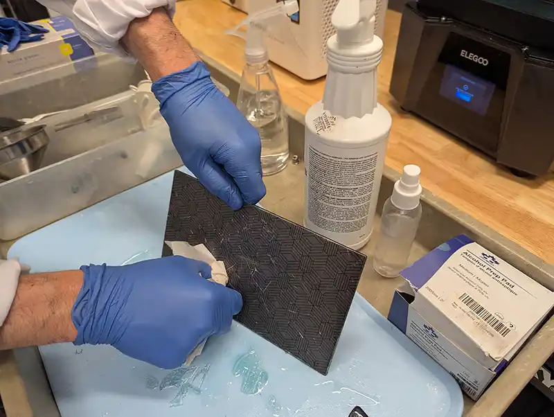 - Déposer le support égoutté sur le tapis propre sur le chariot. Utiliser le spray à alcool pour en déposer sur tout la surface du support. Utiliser un chiffon propre pour retirer les dernières traces de résine.