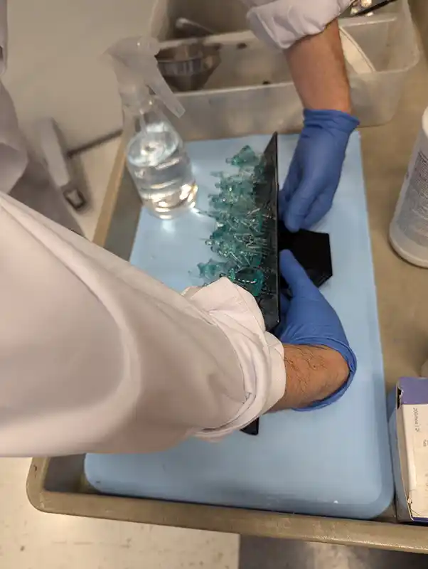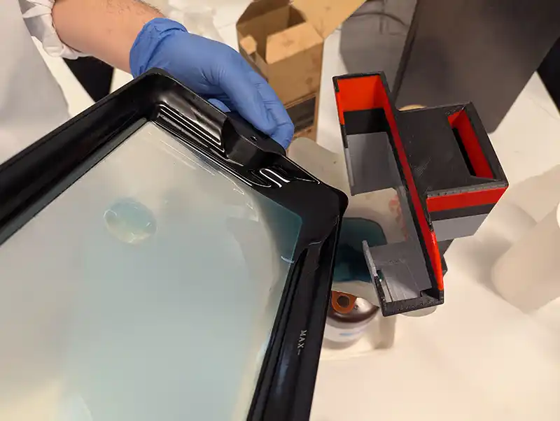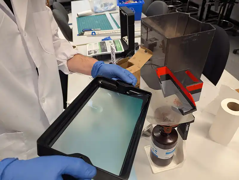 - A l'aide de la raclette, faire tomber dans le bac à résine le surplus de résine situé au dessus du support