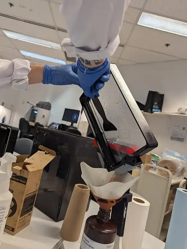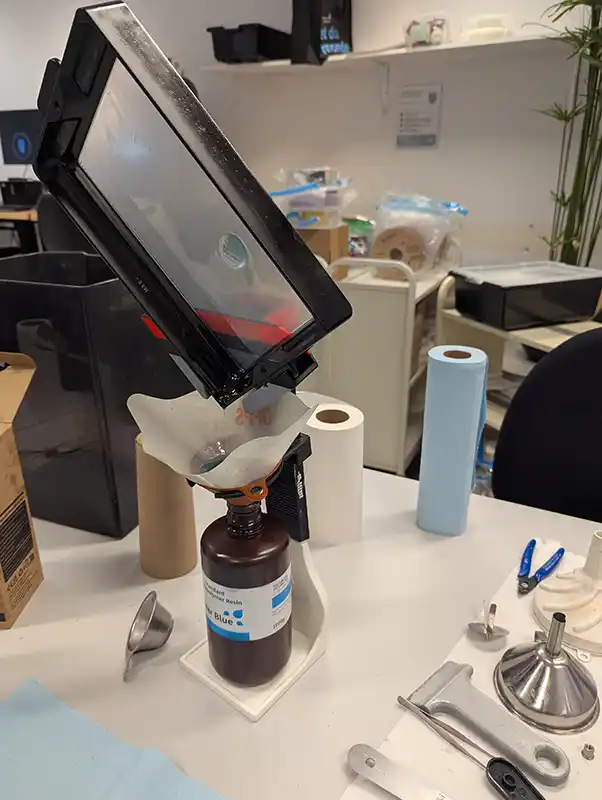 - Vider le surplus restant de résine non utilisée lors de l’impression délicatement dans sa bouteille d’origine en le passant dans un filtre.