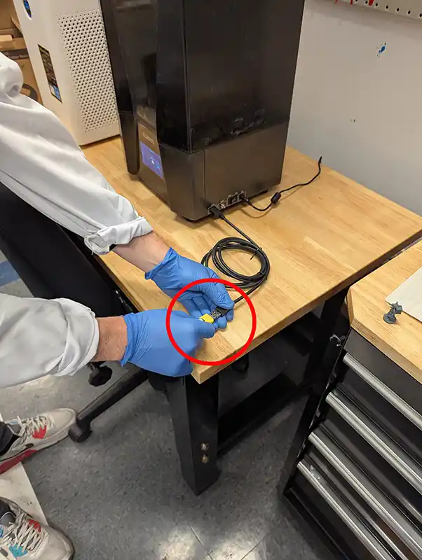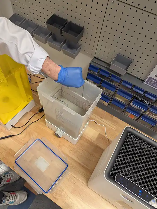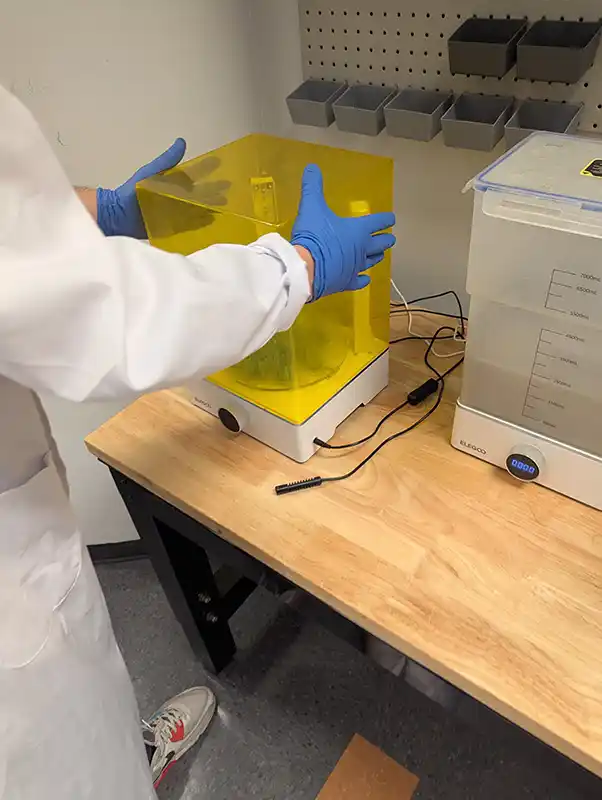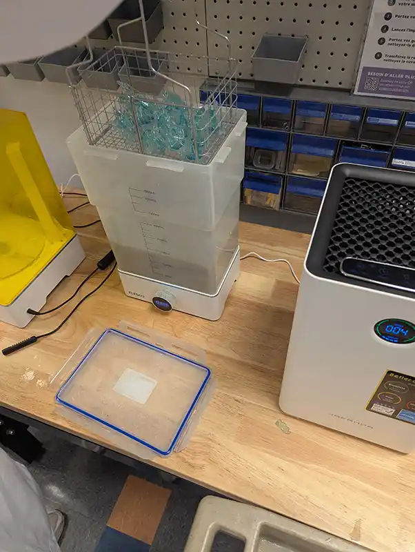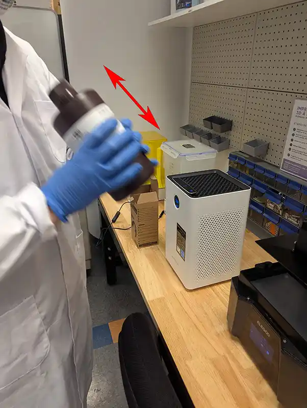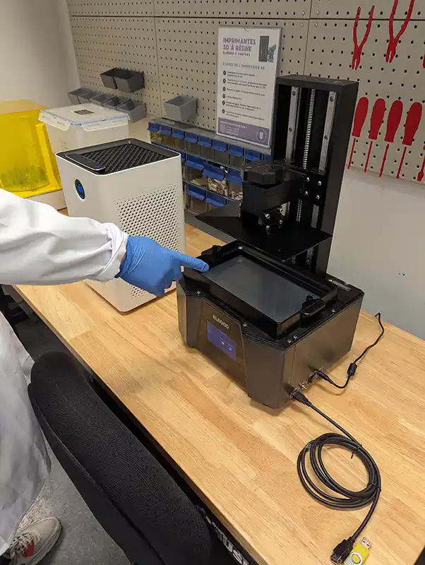 L'imprimante Elegoo Saturn 3 Ultra utilise des résines qui nécessitent une manipulation prudente. Un purificateur d'air est mis en place à côté en plus de la bonne ventilation assurée dans le laboratoire. Nous conseillons fortement les utilisateurs de porter masque, gants, lunettes et blouse de protection pour éviter tout contact cutané.