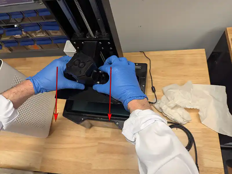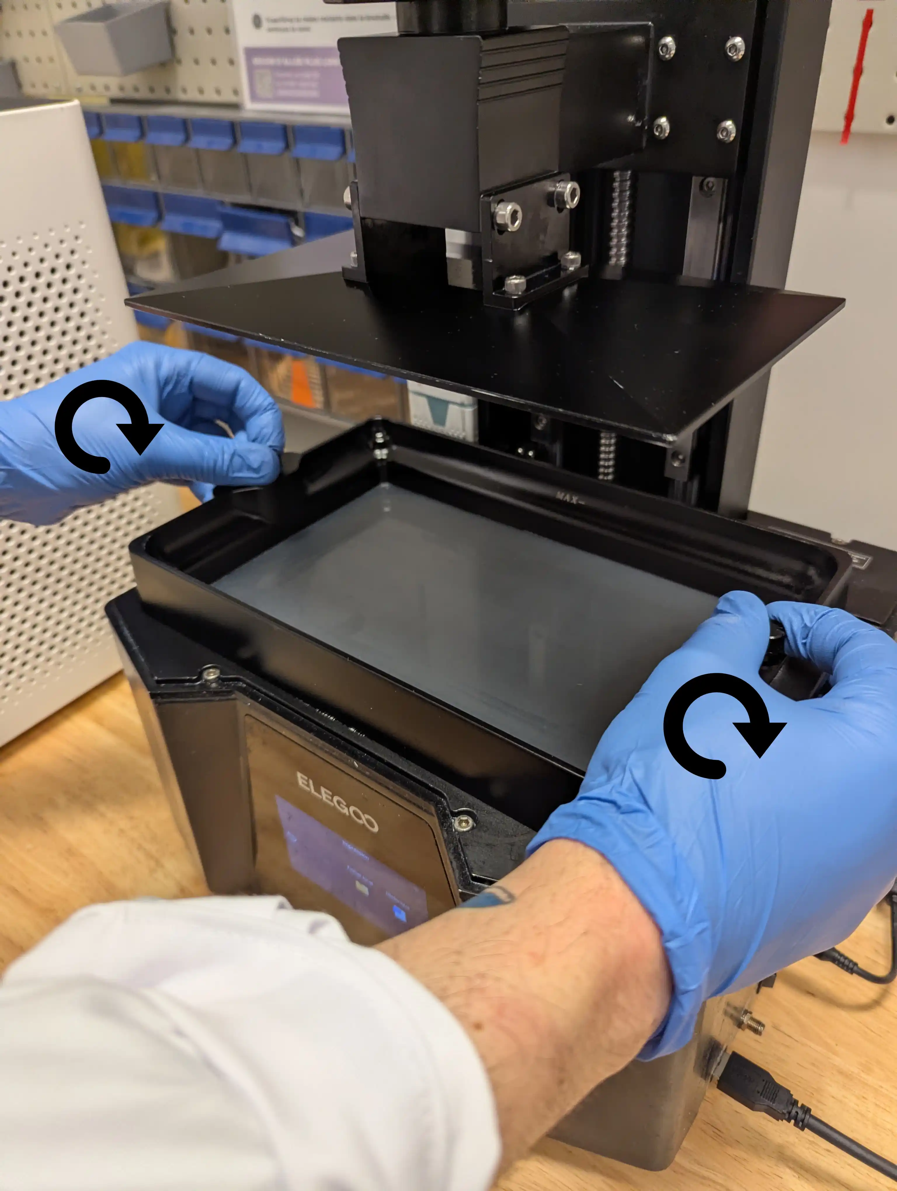 Dévisser les deux vis qui fixent le bac à résine à l'imprimante